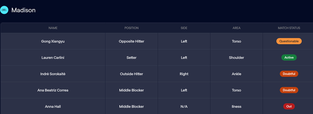 面对卫冕冠军奥斯汀女排,麦迪逊继续派出龚翔宇为首的阵容。球队在输掉首局后,第二局局末顽强追分完成逆转并顺势拿下第三局;第四局,麦迪逊女排状态下滑,开局阶段就被对手拉开分差,主帅果断换下大部分主力力拼决胜局,无奈对手越打越好,比分是22-25/25-21/25-23/12-25/9-15。